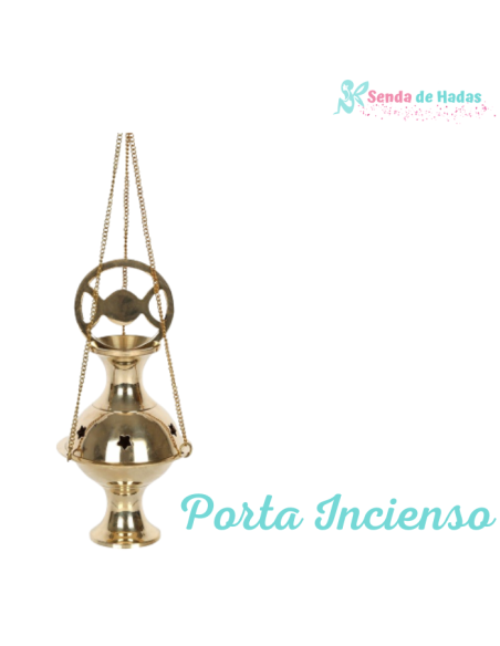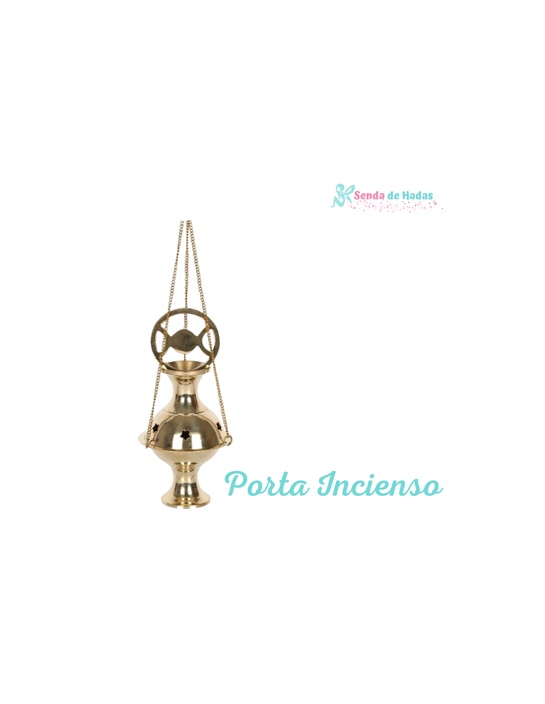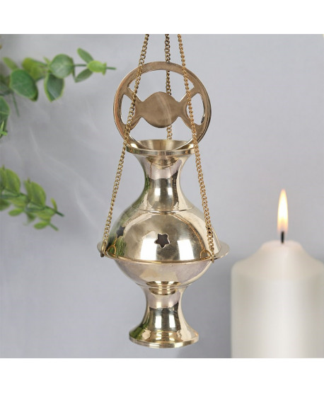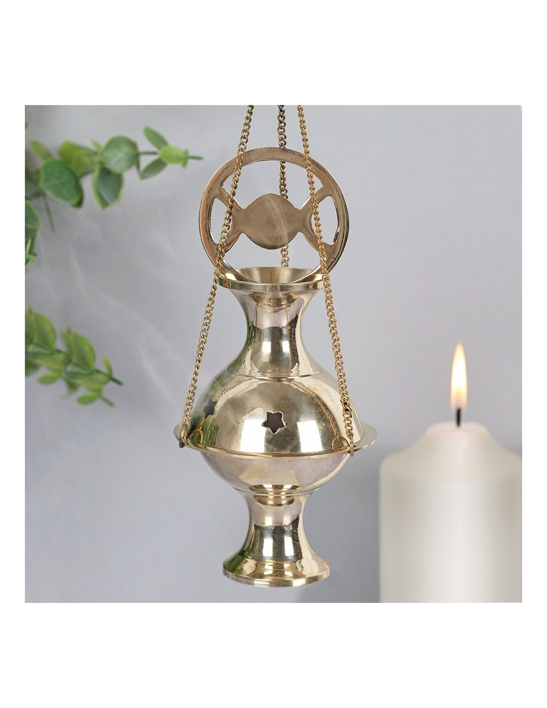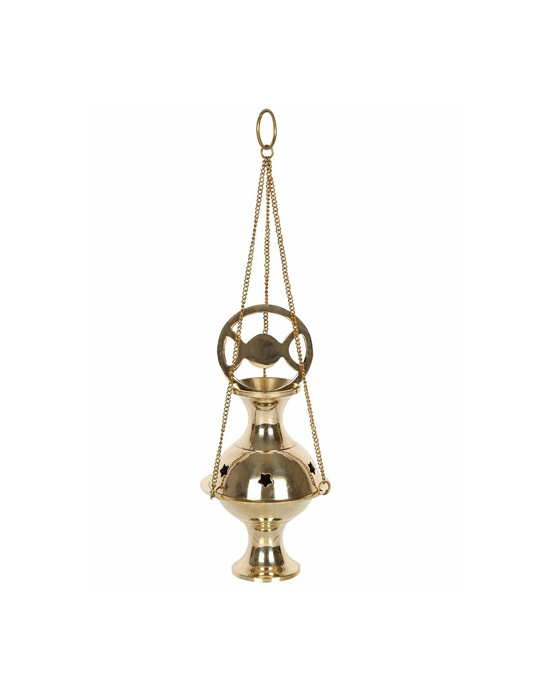 Incensario de latón brillante. Presenta un símbolo de la triple luna, cortes de estrella en la tapa y una cadena conveniente para colgar.
