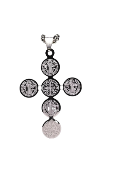 Colgante en forma de Cruz de San Benito, símbolo de protección espiritual y contra las energías negativas. Fabricado en acero bizantino antialérgico, combina fuerza, durabilidad y significado religioso en una pieza elegante y poderosa.