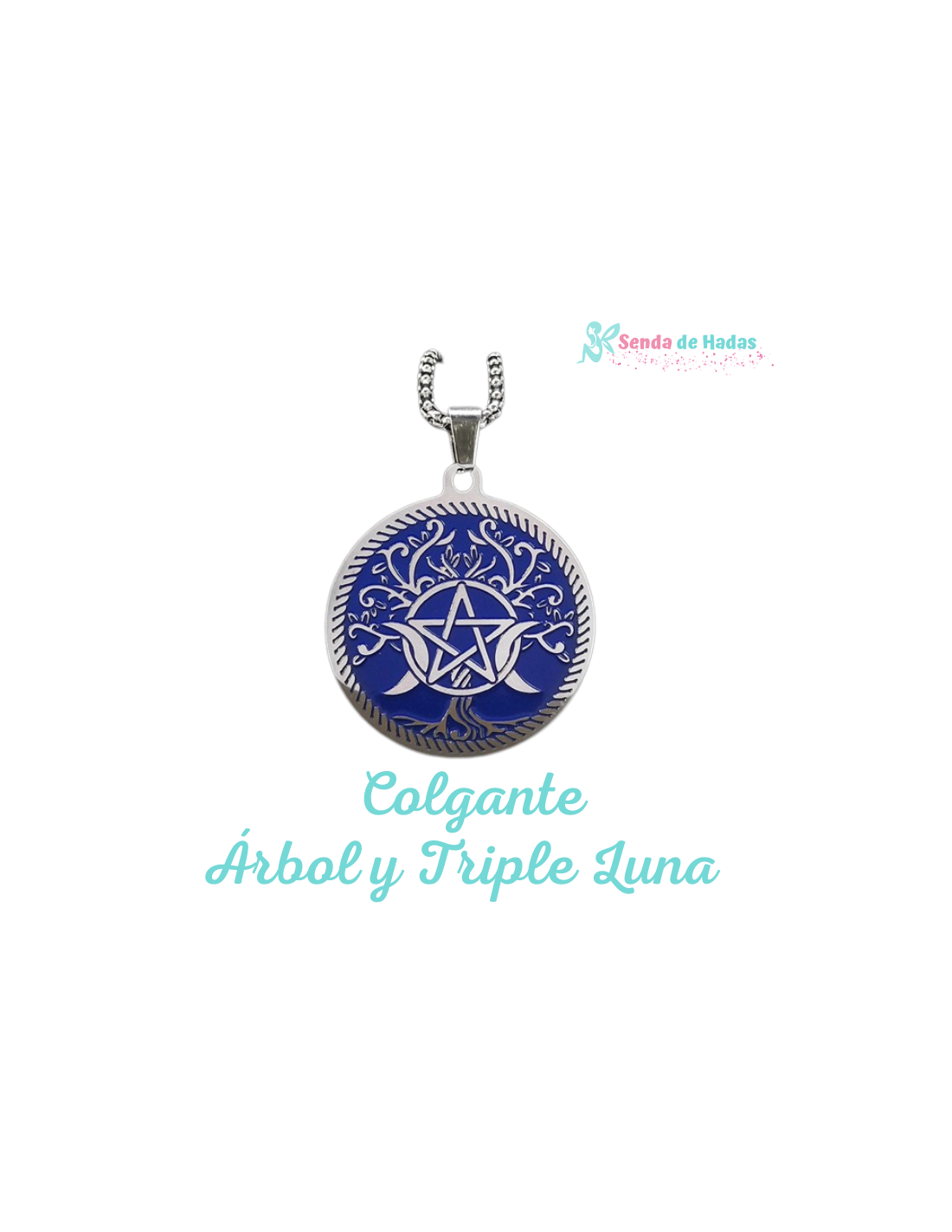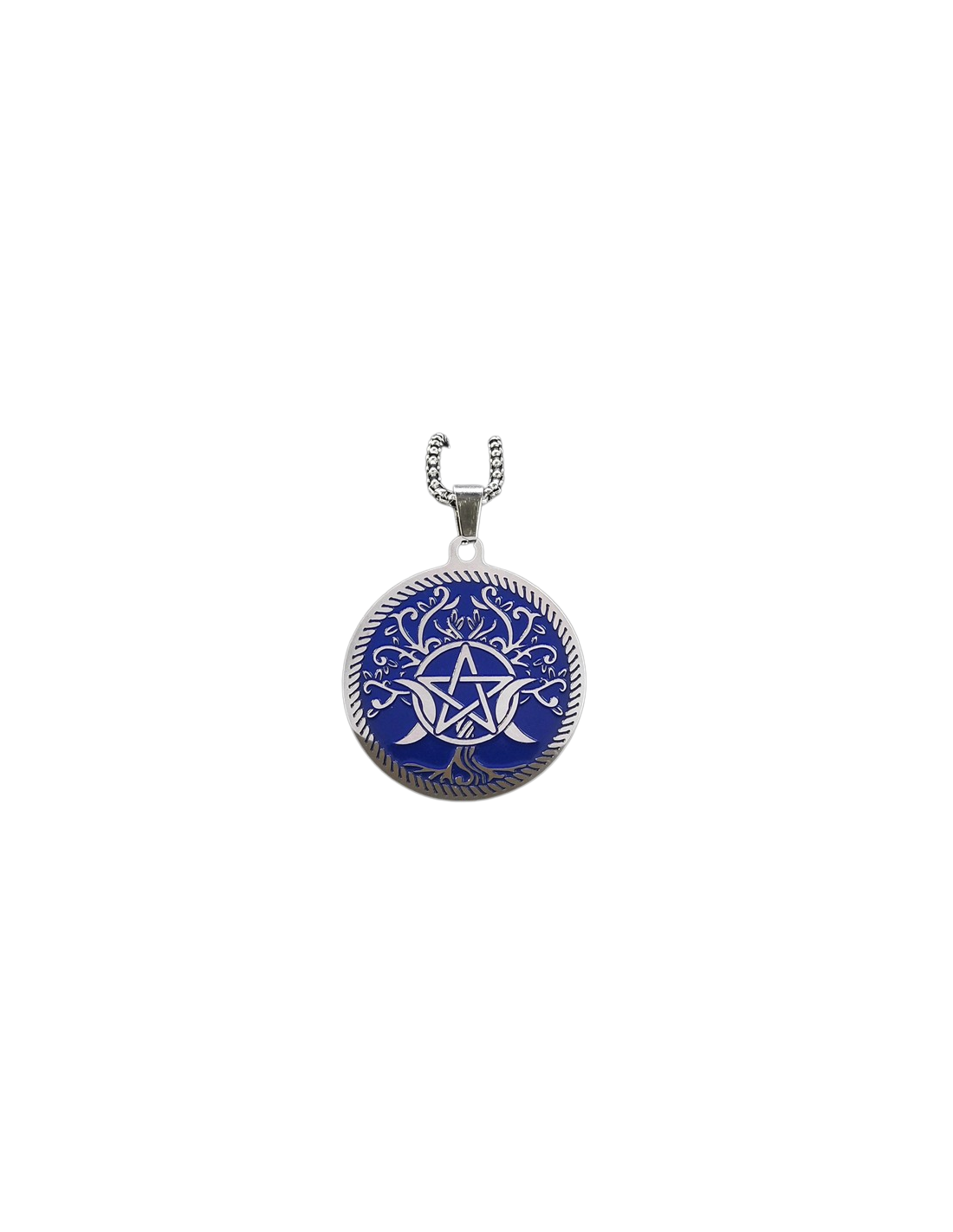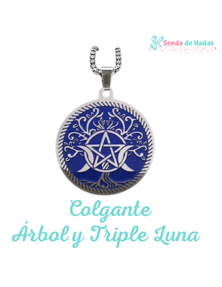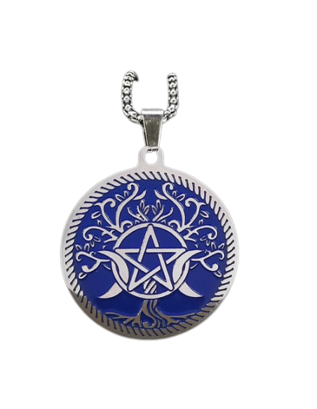 Este impactante colgante presenta un diseño simbólico cargado de significado: un gran árbol sobre fondo azul, donde el tronco revela un pentagrama rodeado por la triple luna, representando la unión entre la tierra, la espiritualidad y los ciclos femeninos.