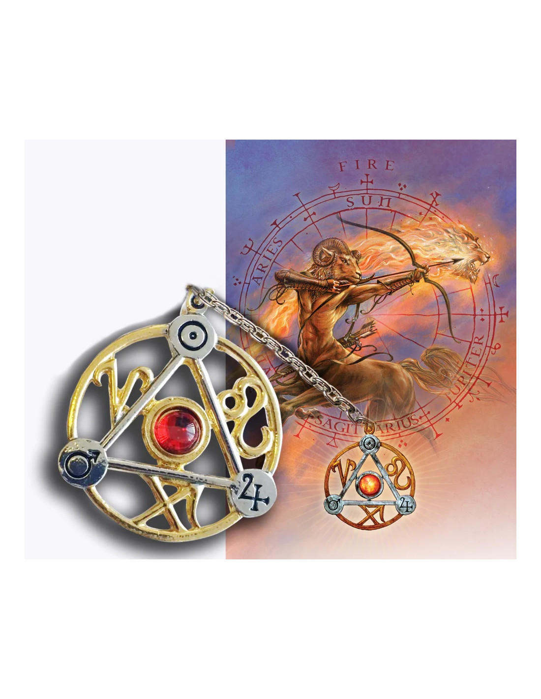 El símbolo del Fuego está adornado con los signos del Zodíaco de Fuego (Aries, Leo y Sagitario) y los Sellos Planetarios (Sol, Júpiter y Marte) para invocar pasión, creatividad, motivación y sensualidad.