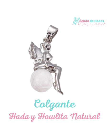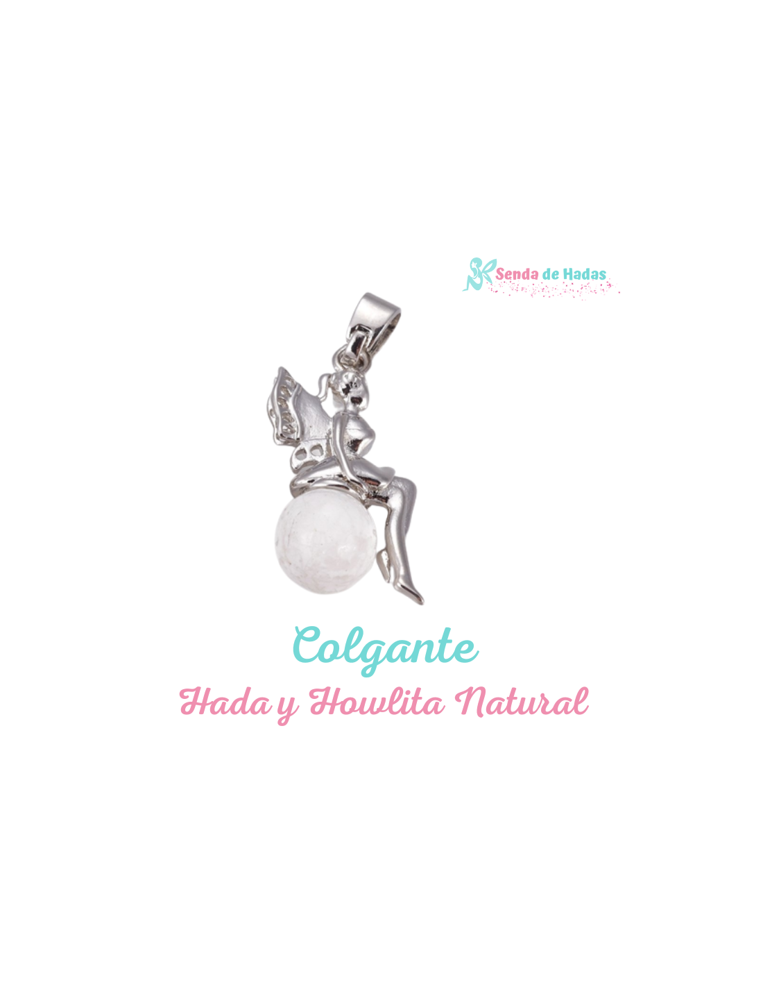 Encantador colgante que muestra una delicada hada sentada sobre una esfera de howlita natural, piedra conocida por sus propiedades calmantes, ideal para aliviar el estrés y fomentar la paz interior.