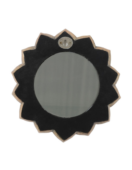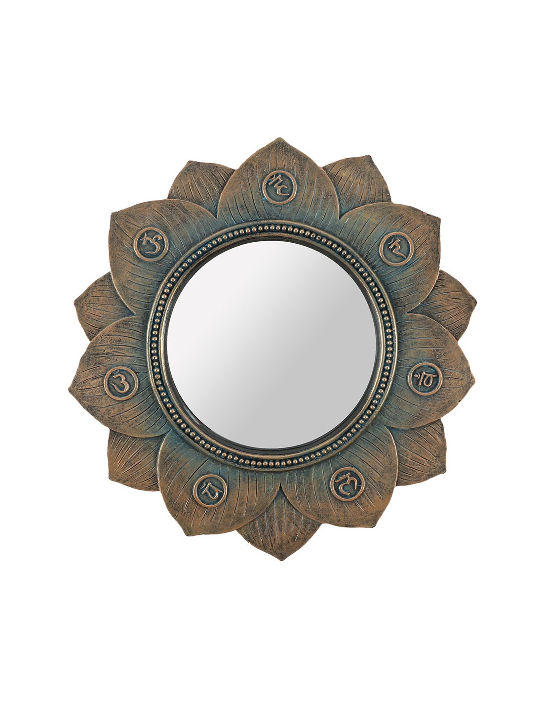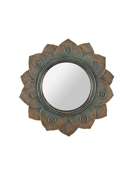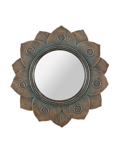 Espejo de pared de flor de loto con símbolos que representan los siete chakras, acabado con un efecto de bronce antiguo.