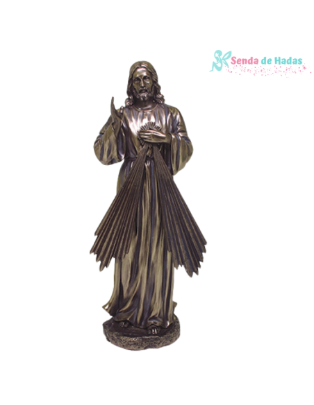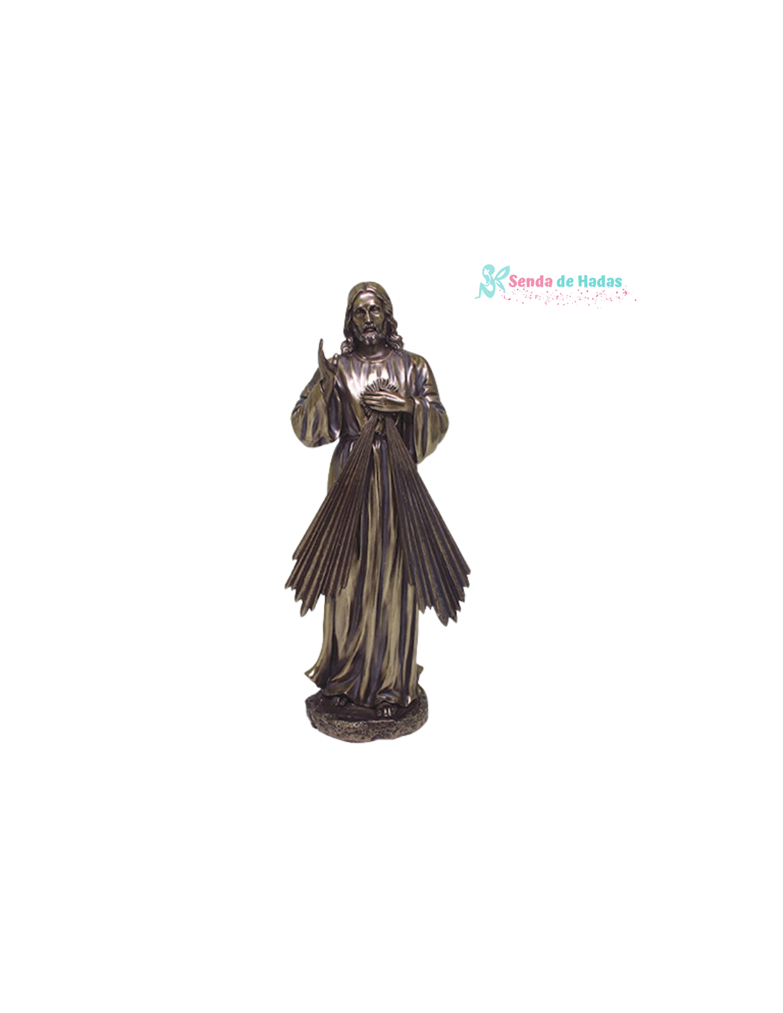 La imagen de la Divina Misericordia de Cristo en bronce es un símbolo de esperanza, compasión y amor infinito. Con una expresión de serenidad y bondad, Jesús extiende su mirada misericordiosa, mientras de su corazón emanan los rayos de luz roja y blanca, representando la sangre y el agua que purifican y renuevan el alma.