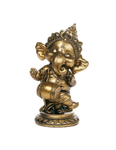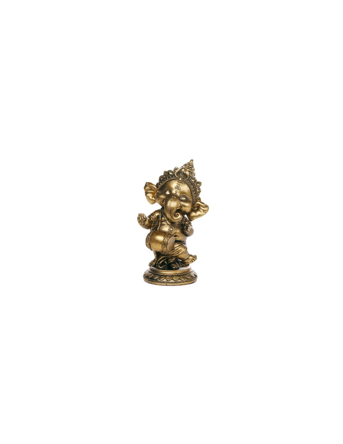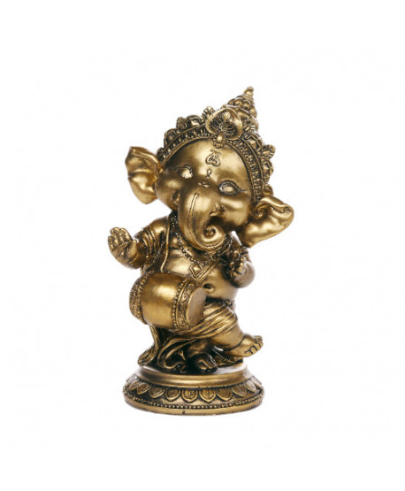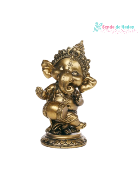 Esta figura de Ganesha, el venerado dios hindú con cabeza de elefante, lo muestra en una animada postura de baile, simbolizando la alegría, la energía y el equilibrio. Ganesha es conocido por ser el eliminador de obstáculos y el dios de la sabiduría y la prosperidad