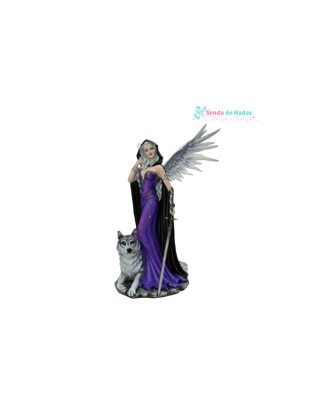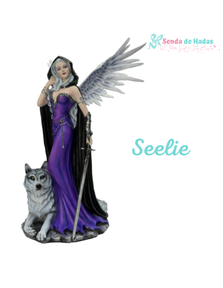 Este Ángel Seelie, vestido con elegante túnica lila, es la personificación de la gracia celestial y la sabiduría de los reinos de la luz. Su espada es un símbolo de justicia, y con ella protege los caminos de la pureza y armonía. A su lado, su fiel lobo blanco representa su lealtad y coraje, siempre dispuesto a defender lo que es justo.
