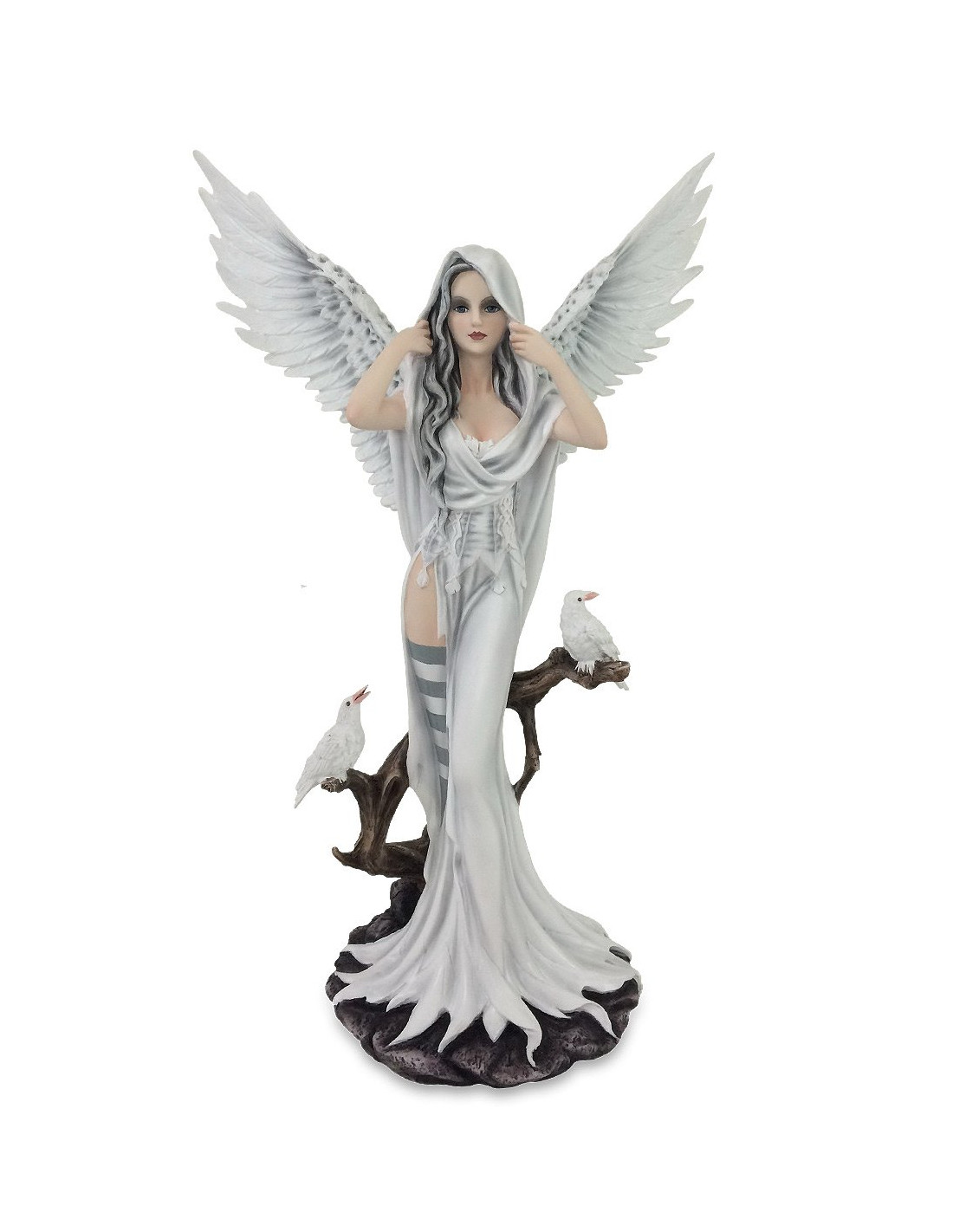 Este Ángel Kyami, con hermoso vestido blanco, emana paz y pureza. Sus preciosas alas blancas brillan con una luz celestial que transmite amor y armonía a su alrededor. A su lado, dos palomas blancas simbolizan la paz eterna y la libertad espiritual.