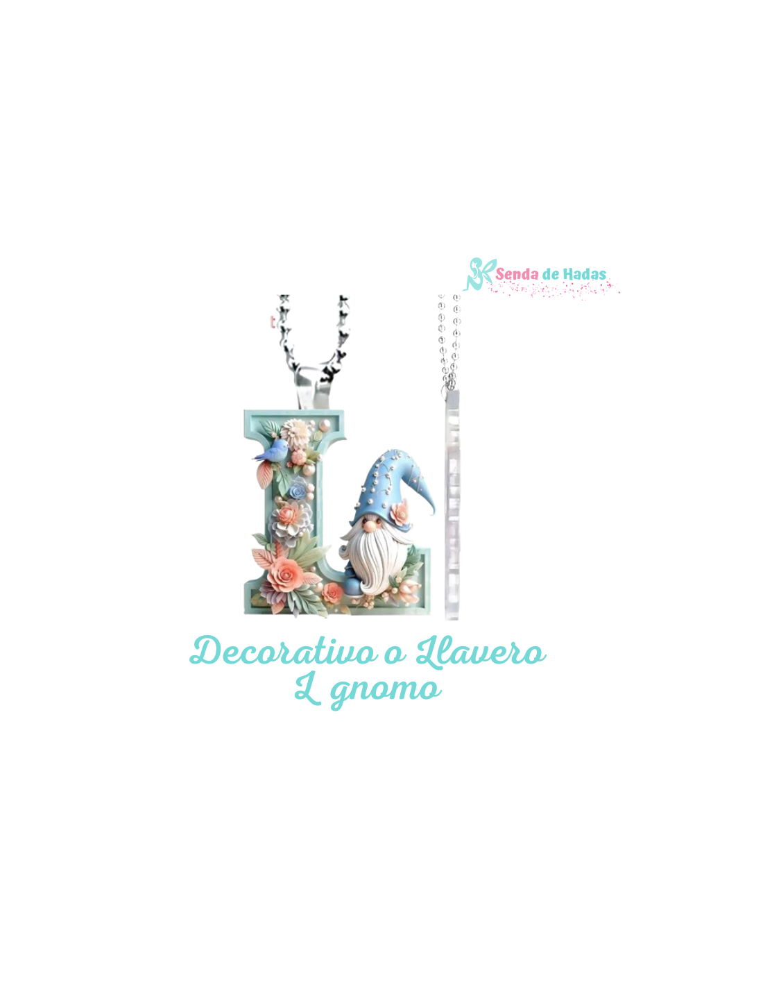 Llavero o colgante decorativo en acrílico de la letra L con decoración floral y gnomo.