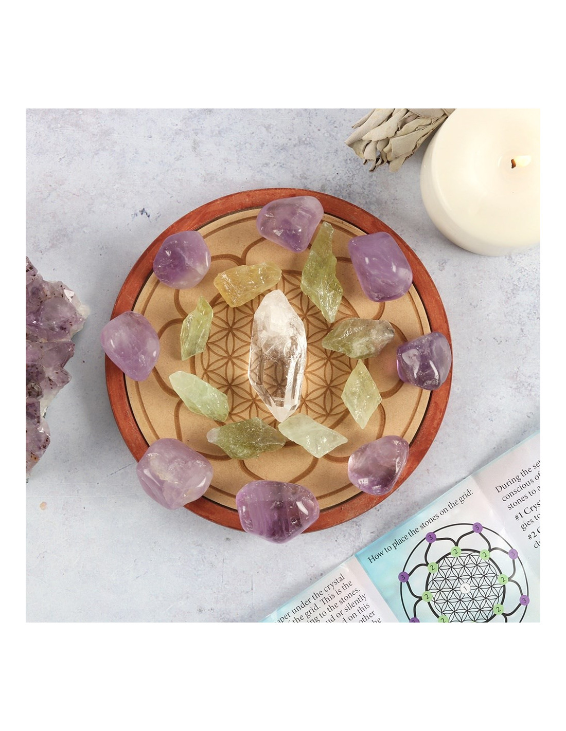 Base de Madera con Flor de la Vida y Cristales – Geometría Sagrada para Intención y Energía