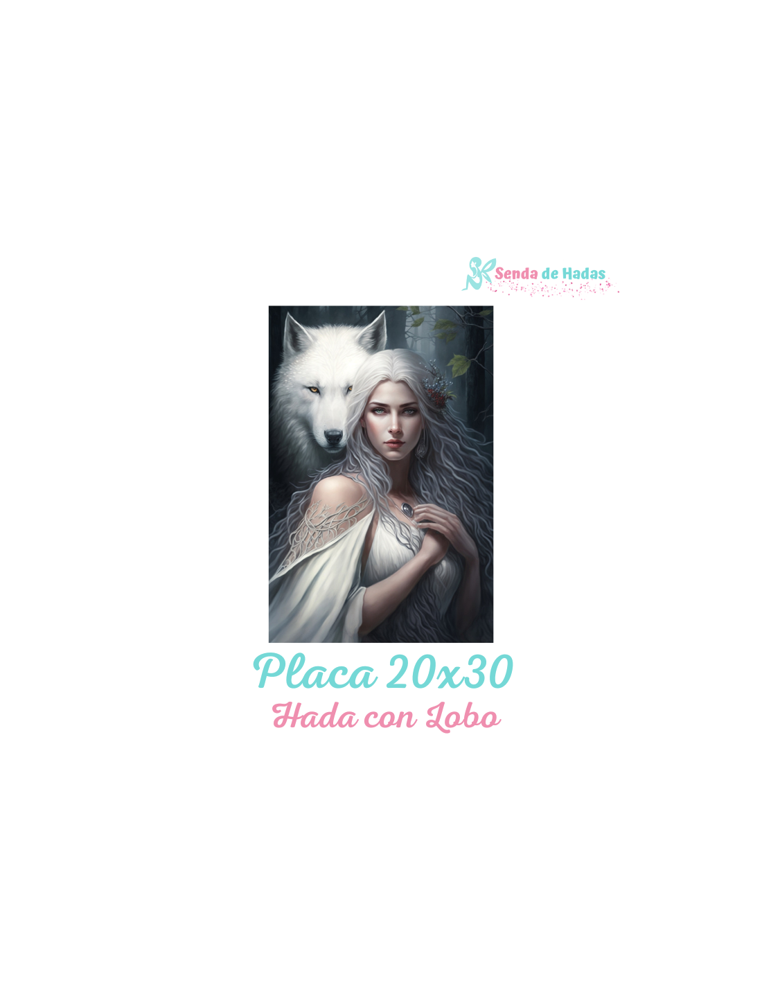 ✨ Magia y Misticismo: Esta impresionante placa captura la esencia de la magia y la naturaleza, con un hada etérea acompañada por un lobo blanco poderoso y majestuoso.