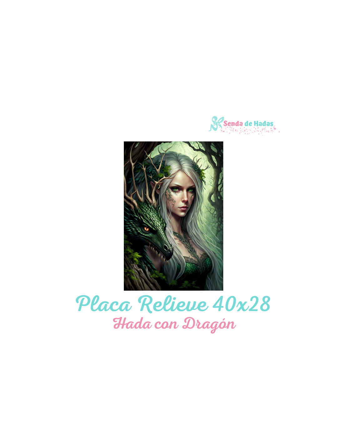- Relieve detallado que destaca la figura del hada y su dragón verde.