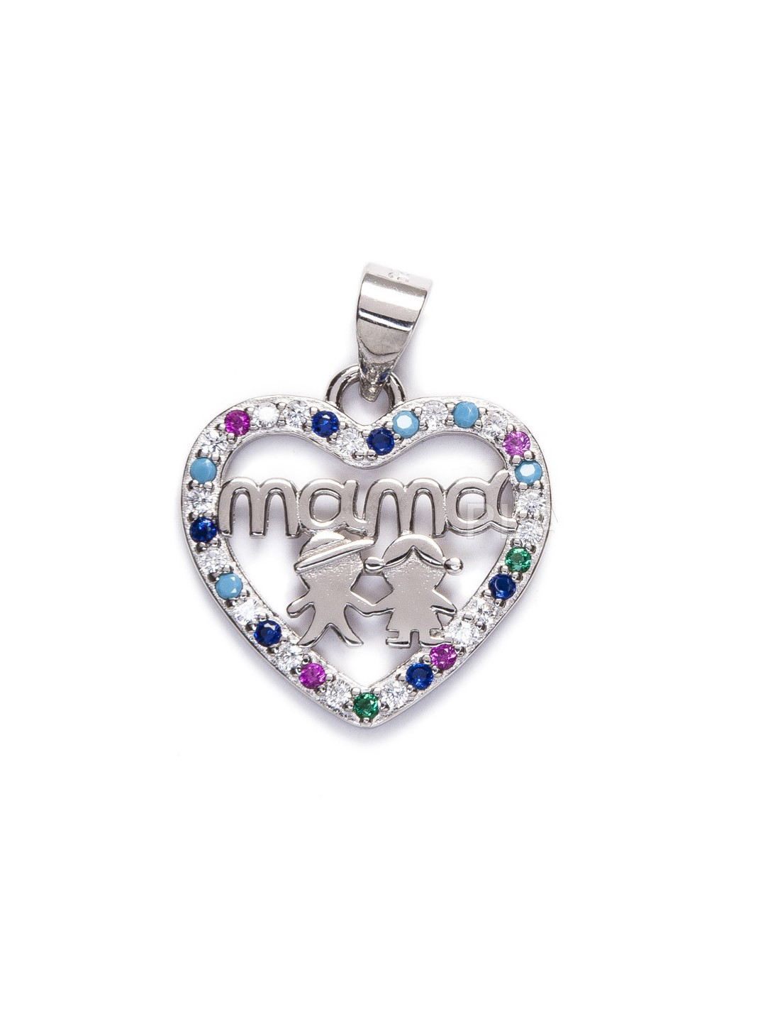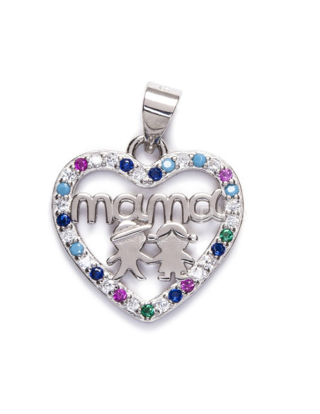 Un tierno y elegante colgante en forma de corazón, elaborado en plata de ley, rodeado de cristales de colores que le dan un toque mágico y luminoso. En su interior, lleva grabada la palabra "Mama" junto a la figura de dos niños, símbolo de amor y unión eterna.