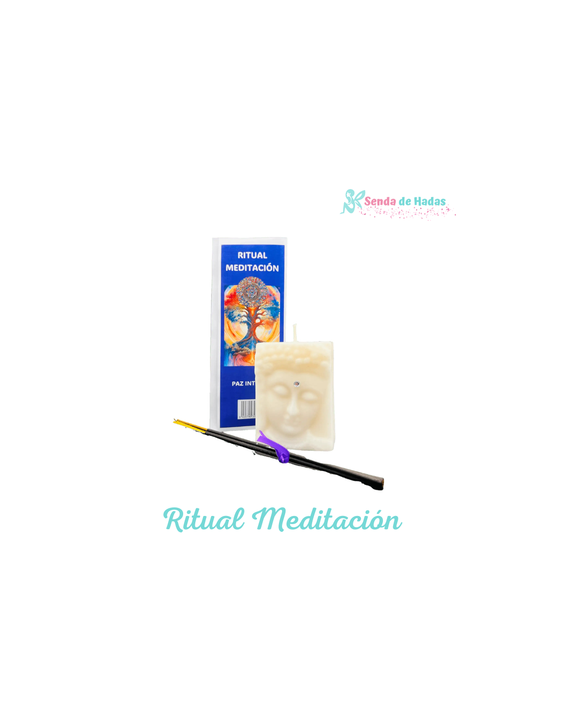 El ritual contiene vela blanca, elementos de limpieza energética y accesorios que potencian la meditación y la conexión con la energía de Buda.